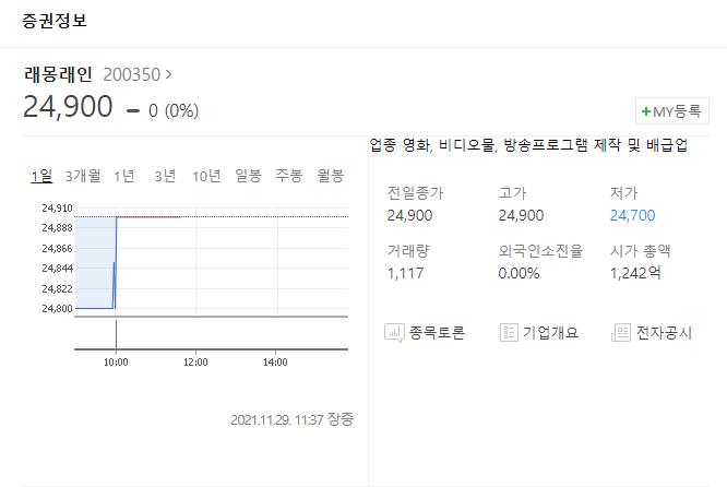 2021-11-29 월요일 11:40 기준으로 현재 24,900원입니다. 현재 주가가 공모가의 2배가 되는 가격이죠?