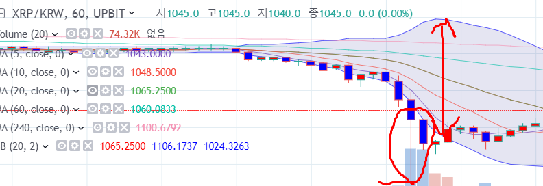 그러면 다시 볼린저밴드 안으로 가격이 형성되게 되게 되는 것입니다 ㅎㅎㅎ