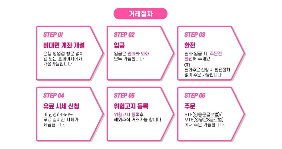 해외주식 투자를 다짐하신 이후 가장 어려운 과정인 '비대면 계좌개설'까지 완료하셨다면 입금, 환전, 설문조사, 매수 주문까지 한방에 끝내보시는건 어떨까요?? (Tip! Step 4 유료시세 신청은 이용하지 않아도 실시간 시세 확인이 가능하니 패스)